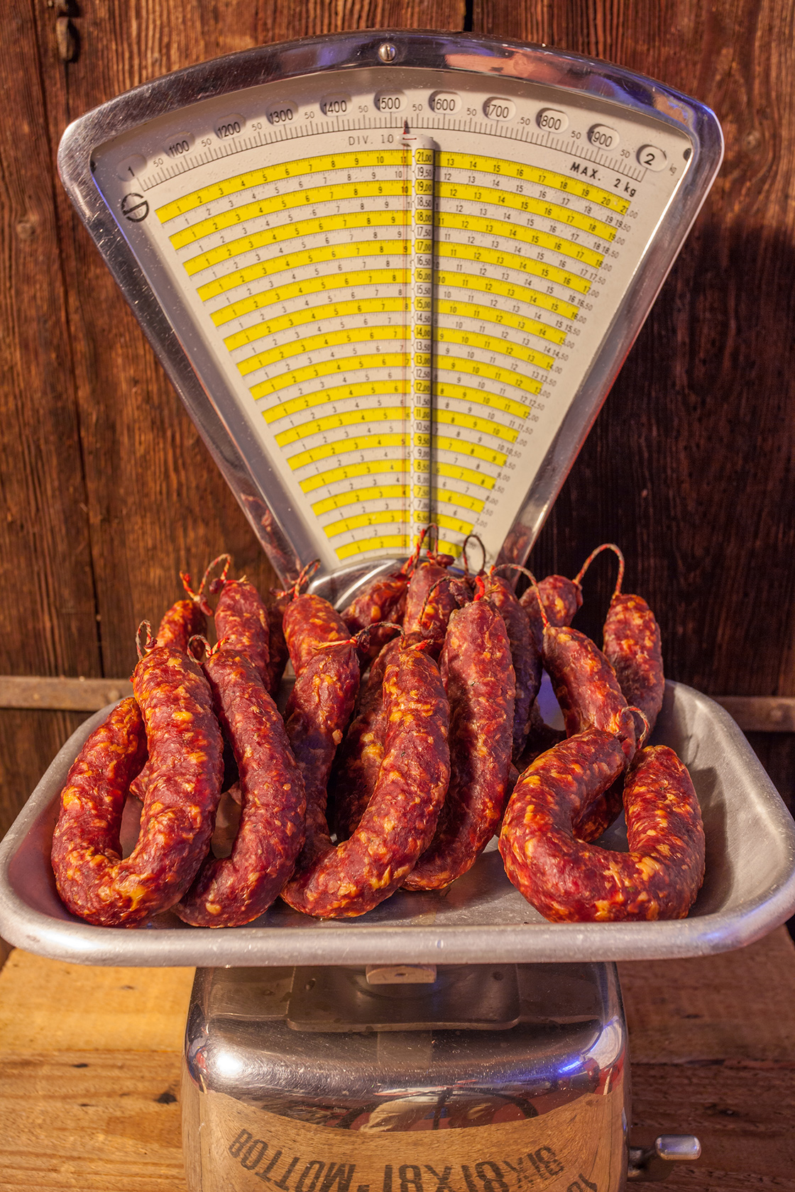Die Dauerwurst wird nach altem Familienrezept mit erstklassigem Fleisch aus eigener Schlachtung und erlesenen Gewürzen hergestellt. Traditionell wird die Dauerwurst im hauseigenen Küchenrauch veredelt.